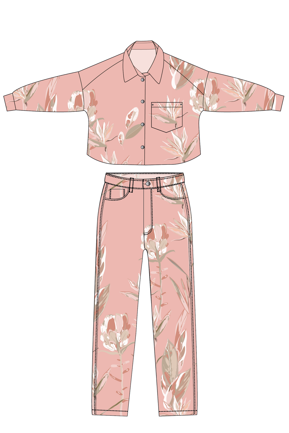 - Sobrecamisa de cuello solapa, hombro caído. Bolsillo en delantero. Cierre frontal con broches, largo cropped, corte recto.